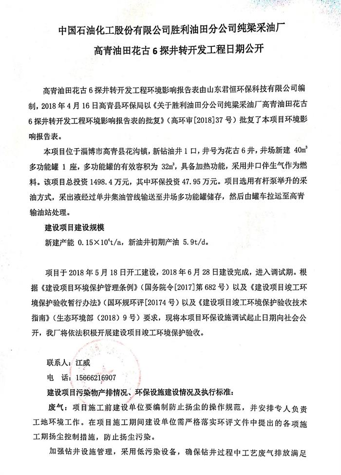 中國石油化工股份有限公司勝利油田分公司純梁采油廠高青油田花古6探井轉開發(fā)工程日期公開