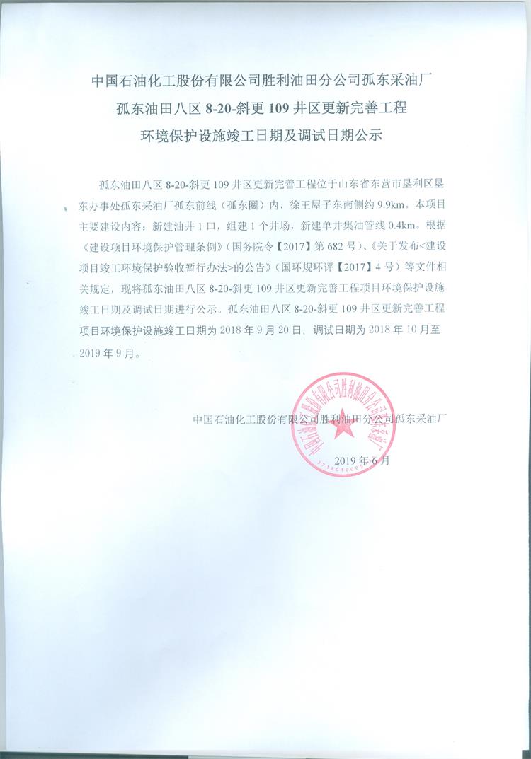 中國石油化工股份有限公司勝利油田分公司孤東采油廠孤東油田八區(qū)8-20-斜更109井區(qū)完善工程環(huán)境保護設(shè)施竣工日期及調(diào)試日期公示